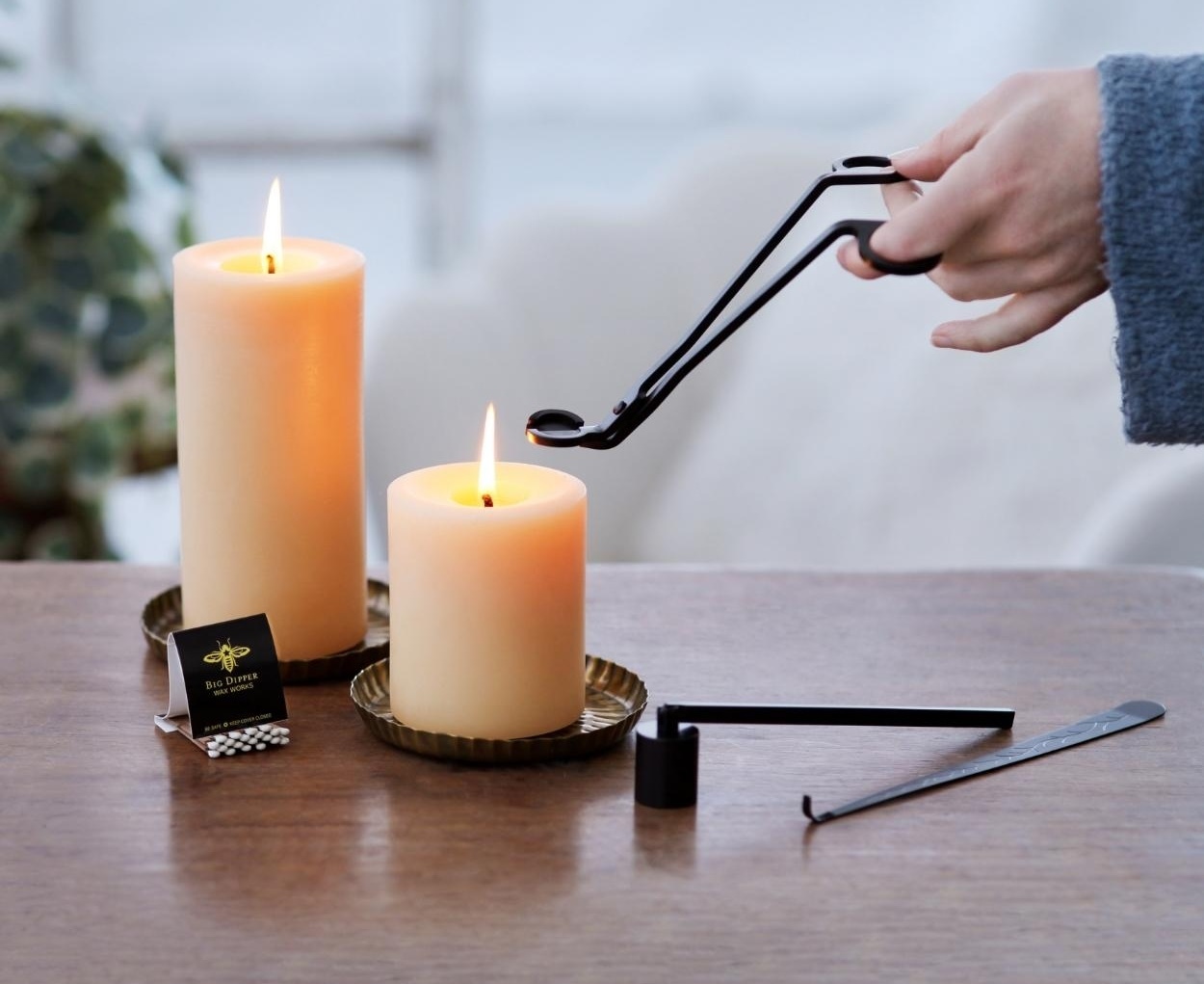 To reduce smoke when extinguishing the flame, use a tool to dip the wick down into the wax pool and lift it back up to re-straighten as soon as the flame is extinguished.